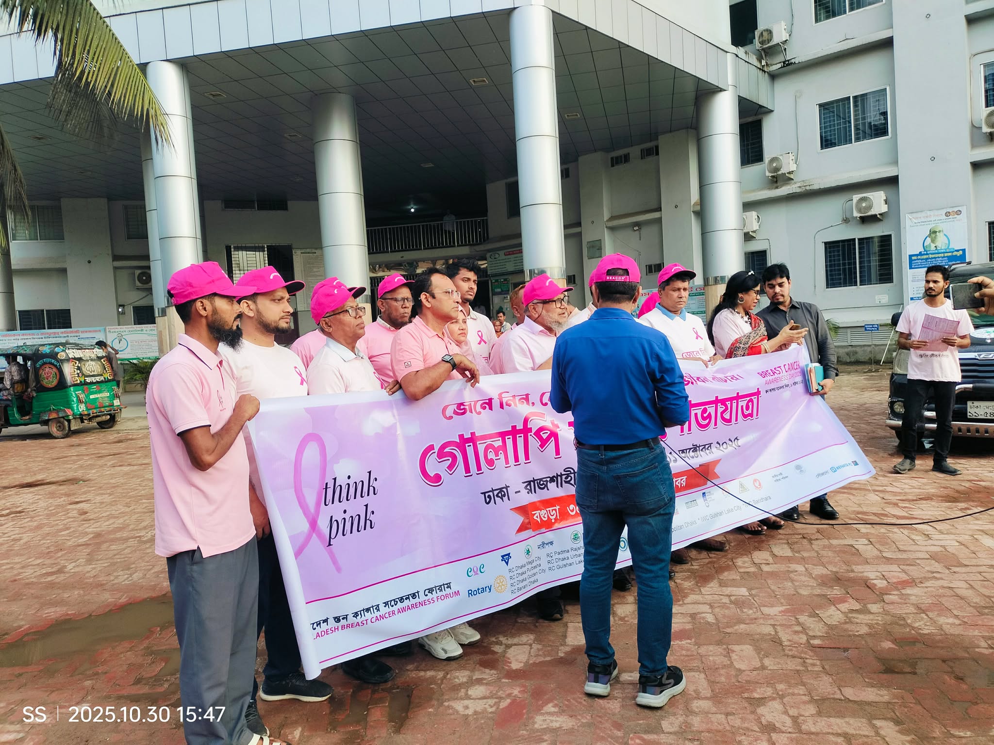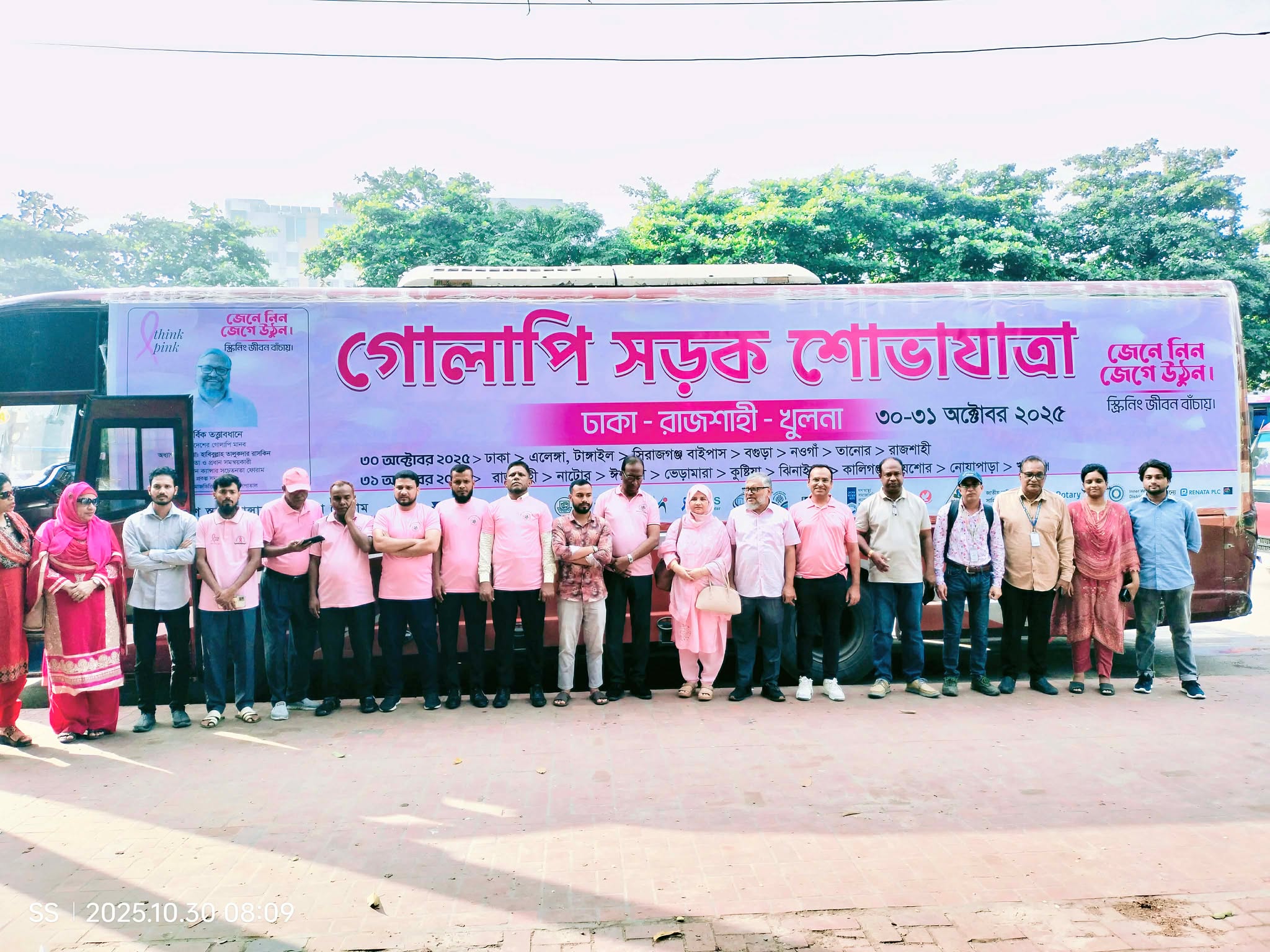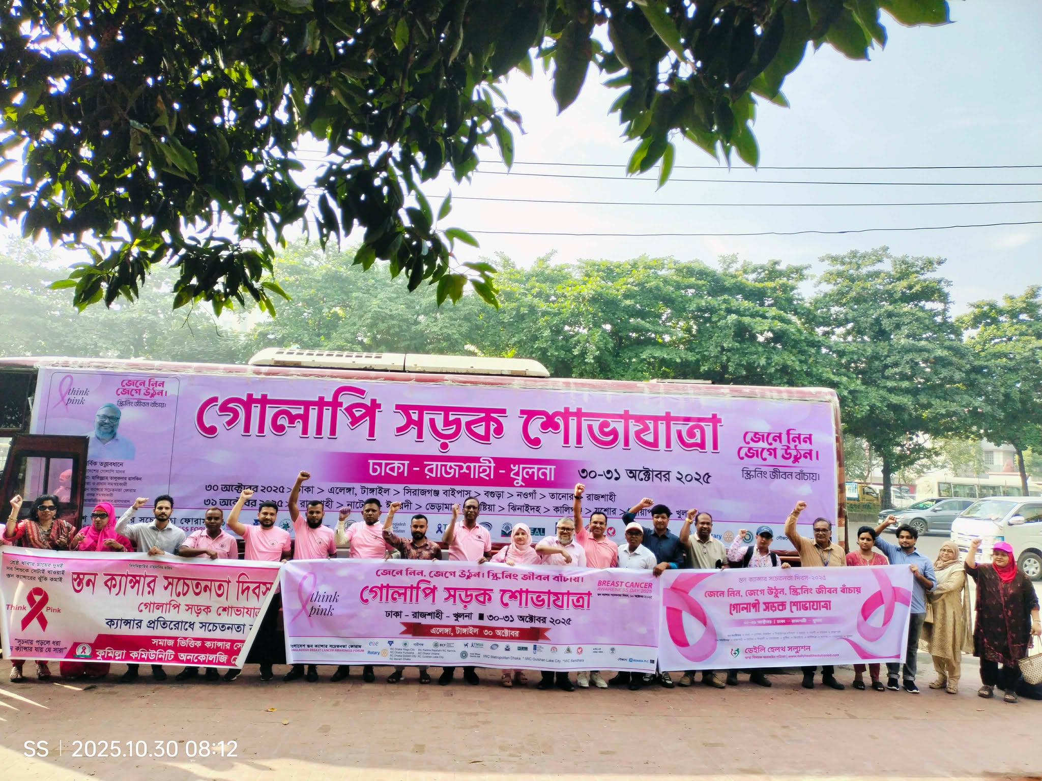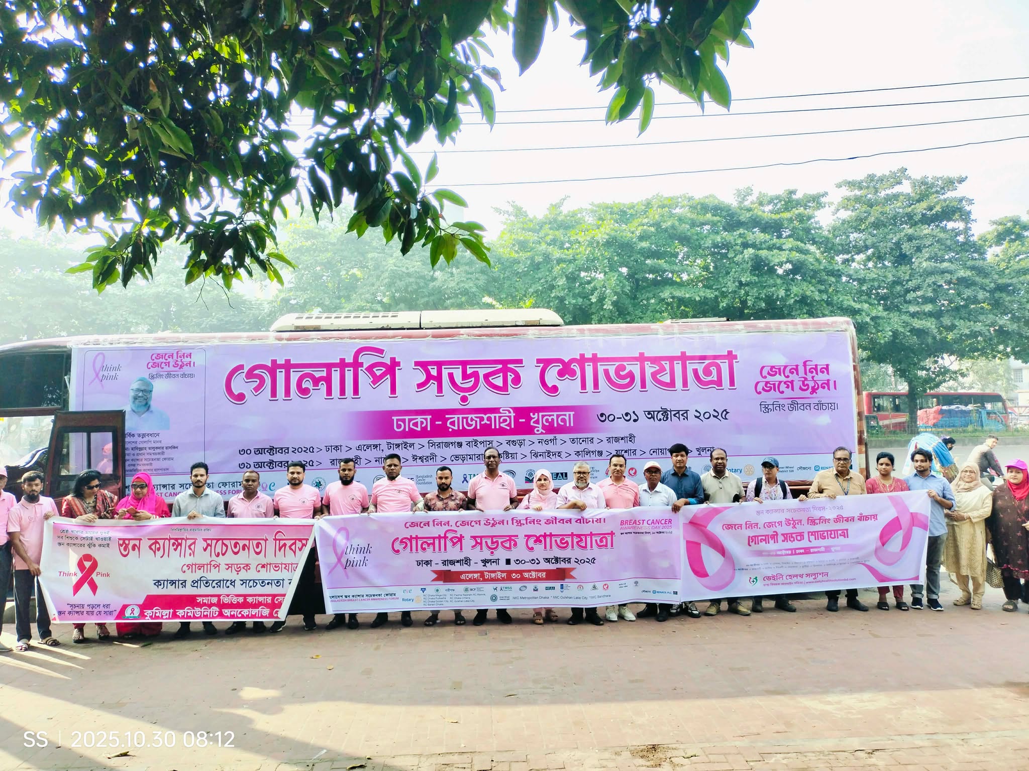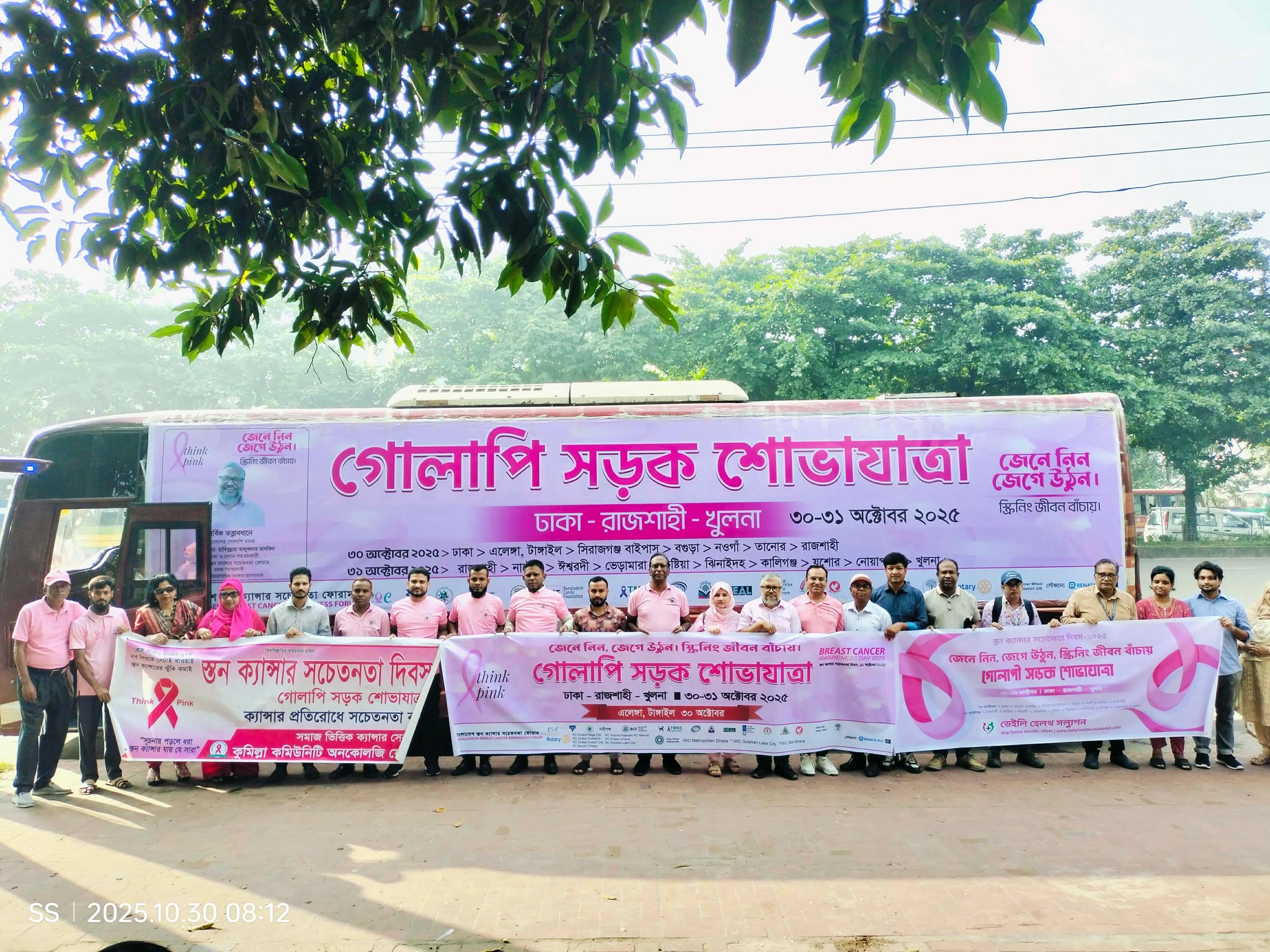 সারা দেশে স্তন ক্যান্সার সচেতনতার বার্তা ছড়িয়ে দিতে বাংলাদেশ স্তন ক্যান্সার সচেতনতা ফোরাম ও স্তন ক্যান্সার প্রতিরোধে সক্রিয় ওয়ার্ল্ড ক্যান্সার সোসাইটি বাংলাদেশসহ ৪৭টি স্বেচ্ছাসেবী সংগঠন প্রতি বছরের মতো এ বছরও গোলাপি সড়ক শোভাযাত্রার আয়োজন করেছে। বৃহস্পতিবার (৩০ অক্টোবর) সকালে ঢাকা থেকে গোলাপি বাস রওনা হয়ে গেছে রাজশাহী-খুলনার উদ্দেশ্যে।